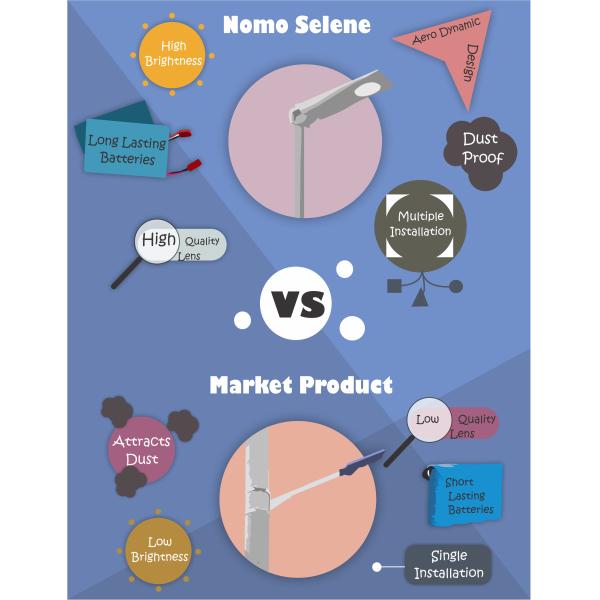 • Comparing the ordinary 15v solar street lights in markets, NOMO GROUP, extended the size of fixture, which enables solar cells to absorb more power naturally from the sun !!!